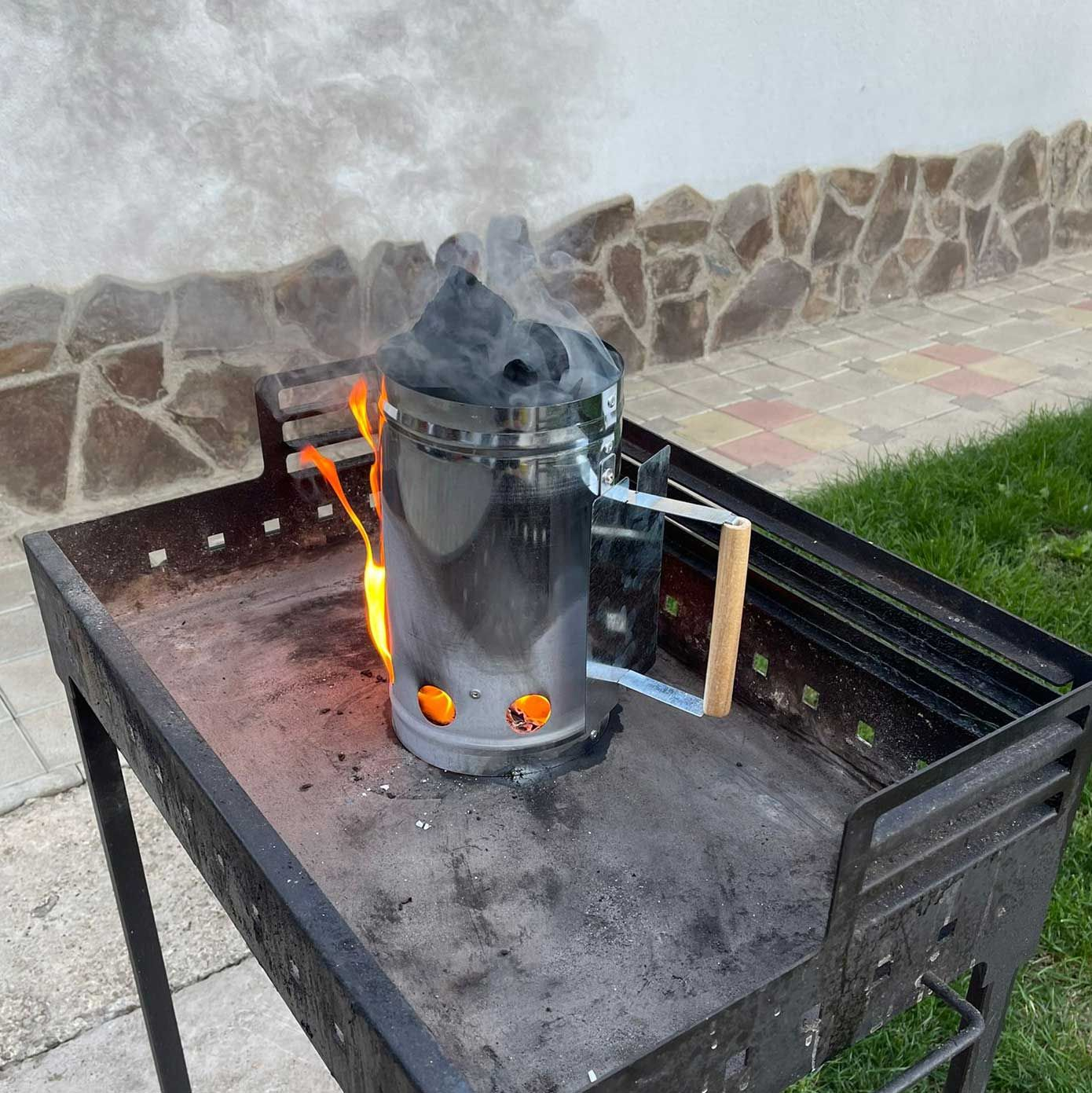 Aprinzator de carbuni 28 x 17 cm Landmann 0131 fabricat din otel cu maner din lemn si aparatoare de aluminiu.